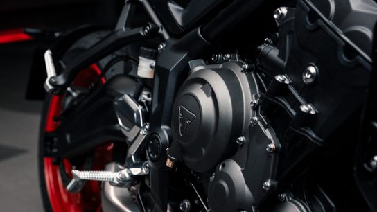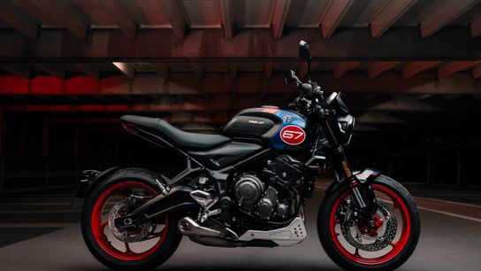 The updated Trident Triple Tribute features sapphire black bodywork complemented by cobalt blue and Diablo red accents across the tank, tail, and front of the motorcycle. A bold “67” graphic on the tank pays homage to the famous Trident model associated with Triumph’s racing success. The design is further enhanced by Diablo red wheels, a color-matched flyscreen, and a sculpted belly pan, all included as standard.