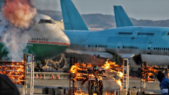 The conditions Golden faced were quite simply death-defying: 13 wooden boards stood before her, stretched down an 850-foot track. Once those wooden walls were ignited, Golden had to battle through 30-foot flames exceeding 2,000 degrees, smashing through them with the front wheel of her motorcycle and the crown of her helmet, all while gusting winds sweeping across the tarmac at 20 miles per hour threatened to engulf her path in a firestorm.