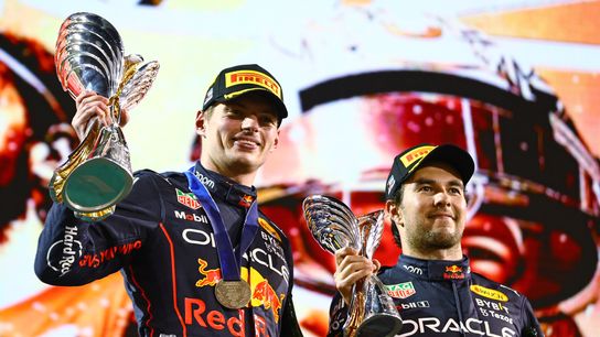 ABU DHABI, UNITED ARAB EMIRATES - NOVEMBER 20: Race Winner Max Verstappen of the Netherlands and Oracle Red Bull Racing and Third placed Sergio Perez of Mexico and Oracle Red Bull Racing celebrate on the podium during the F1 Grand Prix of Abu Dhabi at Yas Marina Circuit on November 20, 2022 in Abu Dhabi, United Arab Emirates. (Photo by Mark Thompson/Getty Images) // Getty Images / Red Bull Content Pool // SI202211202732 // Usage for editorial use only //