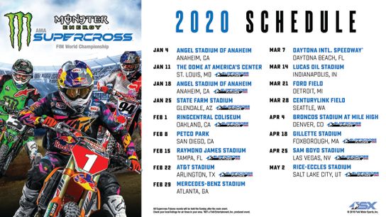 The 17-round schedule for the 2020 season of Monster Energy AMA Supercross, an FIM World Championship, will return to some of the sport’s most iconic stadiums while also rotating fan-favorite markets like St. Louis, Mo., Tampa, Fla. and Foxborough, Mass. back into the routing. The season finale moves to the sports-friendly state of Utah on Saturday, May 2 at Rice-Eccles Stadium in Salt Lake City.