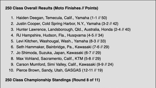 Deegan closed out the moto emphatically, with lap times multiple seconds faster than anyone else on the track. His lead surged to nearly double digits as he took the white flag. Deegan cruised home to wrap up his first career moto sweep, taking the checkered flag 7.9 seconds ahead of Cooper, while Kitchen completed the Yamaha sweep of the moto podium in third, just ahead of Lawrence.