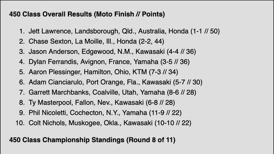 Lawrence’s massive lead in the 450 Class standings has grown to 95 points over Ferrandis, who finished fourth overall (3-5), while Plessinger’s fifth-place finish (7-3) allowed him to maintain his hold of third, 120 points behind Lawrence.