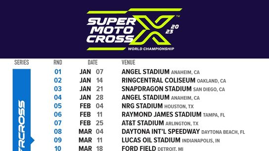 The first of three Triple Crown events during the 2023 Monster Energy AMA Supercross season will take place at Round 4 on Saturday, January 28, from Angel Stadium in Anaheim, California, followed by Rounds 7 and 12 on Saturday, February 25, at AT&T Stadium in Arlington, Texas, and Saturday, April 8, at State Farm Stadium in Glendale, Arizona. The first of two 250SX Class East/West Showdown races will be held on Saturday, April 22, at MetLife Stadium in East Rutherford, New Jersey (Round 14), followed by the Dave Coombs Sr. East/West Showdown on Saturday, May 13, at Rice-Eccles Stadium in Salt Lake City, Utah (Round 17).
