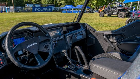 The GENERAL XP 1000 Factory Custom Edition will be available in both two- and four-seat configurations, and includes an exclusive Matte Titanium Metallic finish, complemented by Polaris Blue accent graphics and color-matched interior.