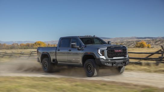 2024 GMC Sierra 2500HD AT4X driving in the desert with mountains in the background.