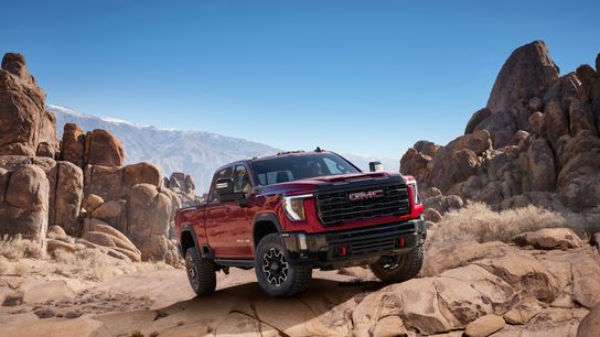 2024 GMC Sierra 2500HD AT4X towing a trailer through rocky mountain terrain.