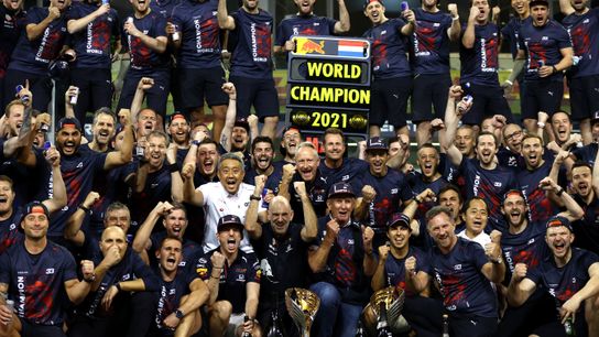 ABU DHABI, UNITED ARAB EMIRATES - DECEMBER 12: Race winner and 2021 F1 World Drivers Champion Max Verstappen of Netherlands and Red Bull Racing celebrates with his team after the F1 Grand Prix of Abu Dhabi at Yas Marina Circuit on December 12, 2021 in Abu Dhabi, United Arab Emirates. (Photo by Bryn Lennon/Getty Images) // Getty Images / Red Bull Content Pool // SI202112120636 // Usage for editorial use only //