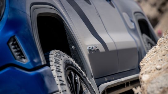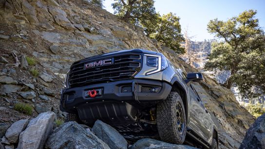 Choosing between the GMC Sierra AT4 and new AT4X could prove daunting for those who are less well-versed in the world of off-road pickups. There are a few things that account for the $12,500 difference price between the AT4 and AT4X. First, the AT4X comes with all of the premium interior upgrades as standard. The AT4X gets only the 6.2-liter gasoline V-8, but the AT4 can be had with either the 6.2-liter V-8 or 3.0-liter Duramax diesel I-6 engine. The AT4X comes with 32.5-inch Goodyear Wrangler Duratrac tires, and the AT4 gets 32.0-inch Goodyear Wrangler Territory rolling stock. The AT4X gets more off-road hardware in the form of the Multimatic DSSV dampers, front and rear electronic locking differentials, and available rock rails, whereas the AT4 comes fitted with Rancho twin-tube shocks and an automatic “G80" rear locking differential.