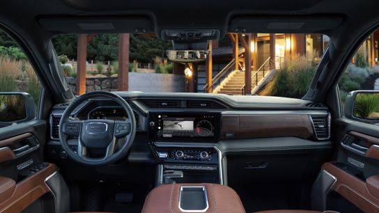 The Ultimate has its own grille dressed in what the company calls Vader Chrome—and it’s sweet-looking with the same color treatment extending to the trim. The dark 22-inch wheels with machined accents are quite handsome. As one might imagine, power side steps are standard here even though this truck isn’t particularly tall. As the Ultimate is an all-in model, GMC included just about every gadget in GMC’s toolbox. This rig receives the CarbonPro composite bed, the six-way folding MultiPro tailgate, and the built-in Kicker sound system. Also, because it comes standard with Super Cruise; GMC redesigned the Ultimate’s rear bumper to incorporate necessary short and long-range radar hardware. Inside the cabin is a significant makeover including a new 12.3-inch digital instrument panel and a 13.4-inch center touchscreen. The gauge cluster is highly configurable with the updated infotainment system now supporting Google’s app store, maps, and voice assistant. Wireless Apple CarPlay and Android Auto come standard with the big touchscreen as well – a huge heads-up display is also available. Models with front bucket seats feature a T-shaped electronic shifter and newly designed center console. Those with a front bench seat have a column-mounted shifter. Additionally, upper trims now come standard with a power-adjustable steering column.