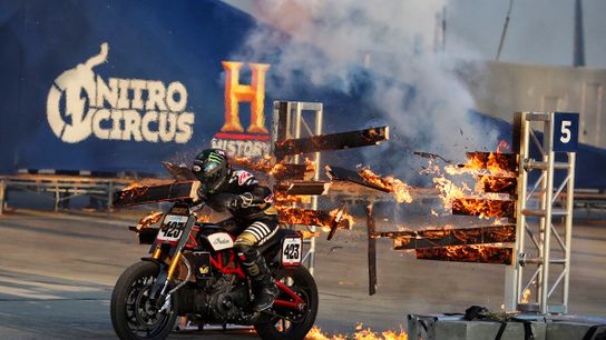 The conditions Golden faced were quite simply death-defying: 13 wooden boards stood before her, stretched down an 850-foot track. Once those wooden walls were ignited, Golden had to battle through 30-foot flames exceeding 2,000 degrees, smashing through them with the front wheel of her motorcycle and the crown of her helmet, all while gusting winds sweeping across the tarmac at 20 miles per hour threatened to engulf her path in a firestorm.