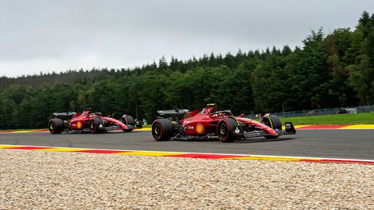 SPA, BELGIUM - AUGUST 28: Max Verstappen of the Netherlands driving the (1) Oracle Red Bull Racing RB18 leads Charles Leclerc of Monaco driving the (16) Ferrari F1-75 during the F1 Grand Prix of Belgium at Circuit de Spa-Francorchamps on August 28, 2022 in Spa, Belgium. (Photo by Rudy Carezzevoli/Getty Images) // Getty Images / Red Bull Content Pool // SI202208280457 // Usage for editorial use only //