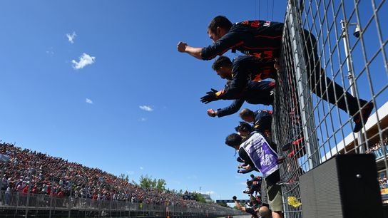 MONTREAL, QUEBEC - JUNE 19: Race winner Max Verstappen of the Netherlands driving the (1) Oracle Red Bull Racing RB18 passes his team celebrating on the pitwall during the F1 Grand Prix of Canada at Circuit Gilles Villeneuve on June 19, 2022 in Montreal, Quebec. (Photo by Dan Mullan/Getty Images) // Getty Images / Red Bull Content Pool // SI202206191028 // Usage for editorial use only //
