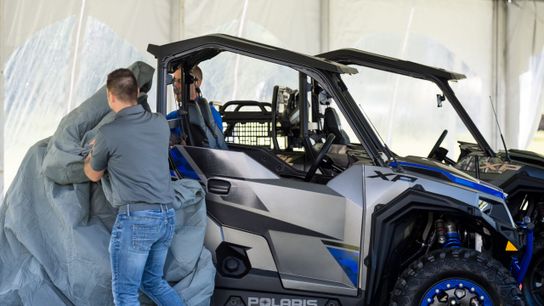 The GENERAL XP 1000 Factory Custom Edition will be available in both two- and four-seat configurations, and includes an exclusive Matte Titanium Metallic finish, complemented by Polaris Blue accent graphics and color-matched interior.
