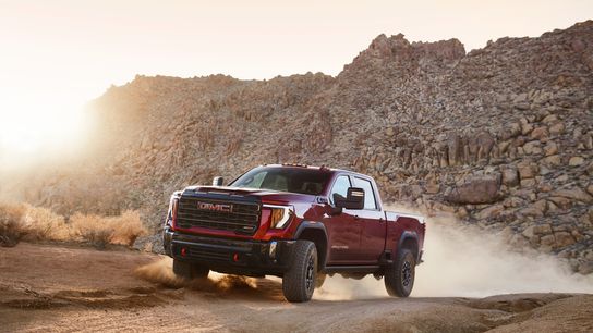 2024 GMC Sierra 2500HD AT4X driving in the desert with mountains in the background.
